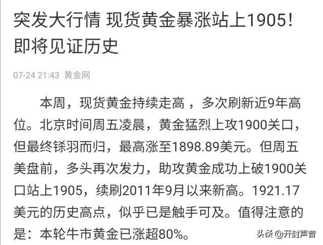 其他网友回答:近期黄金价格持续大涨,到7月24日,国际黄金现货价格已经突破了1900美元每盎司,前一轮黄金的高点是在2011年1920美元附近,当时很多人在高位追高被套,多年都没有解套,不过这一轮黄金上涨很强,当年组团杀进黄金被套的大妈们,也都终于迎来了解套。