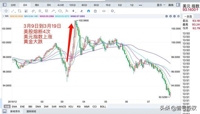 今年以来,美元也是走了一轮过山车,先是从3月9日开始因为国际原油价格暴跌以及美股暴跌,导致美元流动性缺失,导致全球各大机构纷纷抛售资产换取美元,所以美元在这个过程是升值的,这个过程直到美联储推出无限QE才止住。美元指数从94.6上涨到103,仅仅用了10天时间。在这个过程中黄金资产也遭受了抛售,所以黄金的价格是下跌的。