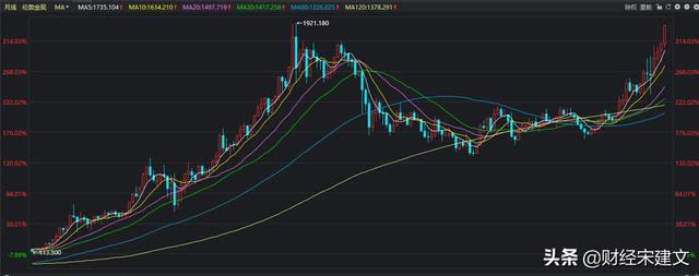 但是其实,如果我们看看之前的数据,黄金价格从1450美元上涨到1730美元其实用了也就不到一个月时间,这个上涨的价格是280美元,而时间区间就是3月19日到4月14日;而这次黄金价格从1800美元上涨到1960美元,用的时间2个星期,从7月17到7月底。