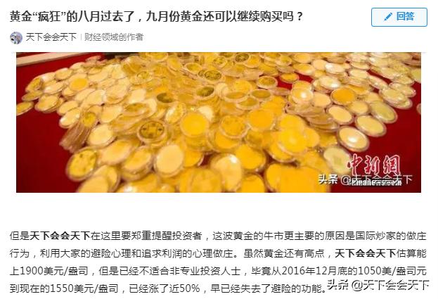 其他网友回答:在2019年9月8日,天下会会天下在悟空问答《黄金“疯狂”的八月过去了,九月份黄金还可以继续购买吗》中回答,这波黄金的牛市更主要的原因是国际炒家的做庄行为,利用大家的避险心理和追求利润的心理做庄。虽然黄金还有高点,天下会会天下估算能上1900美元/盎司,但是已经不适合非专业投资人士,毕竟从2016年12月底的1050美/盎司元到现在的1550美元/盎司,已经涨了近50%,早已经失去了避险的功能。